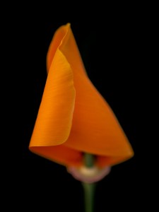 This summer I decided to portray the flower of the California Poppy, Eschscholzia californica, before it opens. These flowers open when they are in full sun, remaining closed from evening to mid-morning. The pattern of the folded petals interested me, and I thought that I could come up with a variety of different pictures of them. Below is my first photo, which I liked and which inspired me to make more.