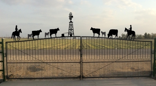 Or, it might just be that the combination of wire and cow is evoking the cut-metal silhouettes that often adorn ranch entrances here. They come in every size and degree of complexity; here’s one of the fancier ones as an example.