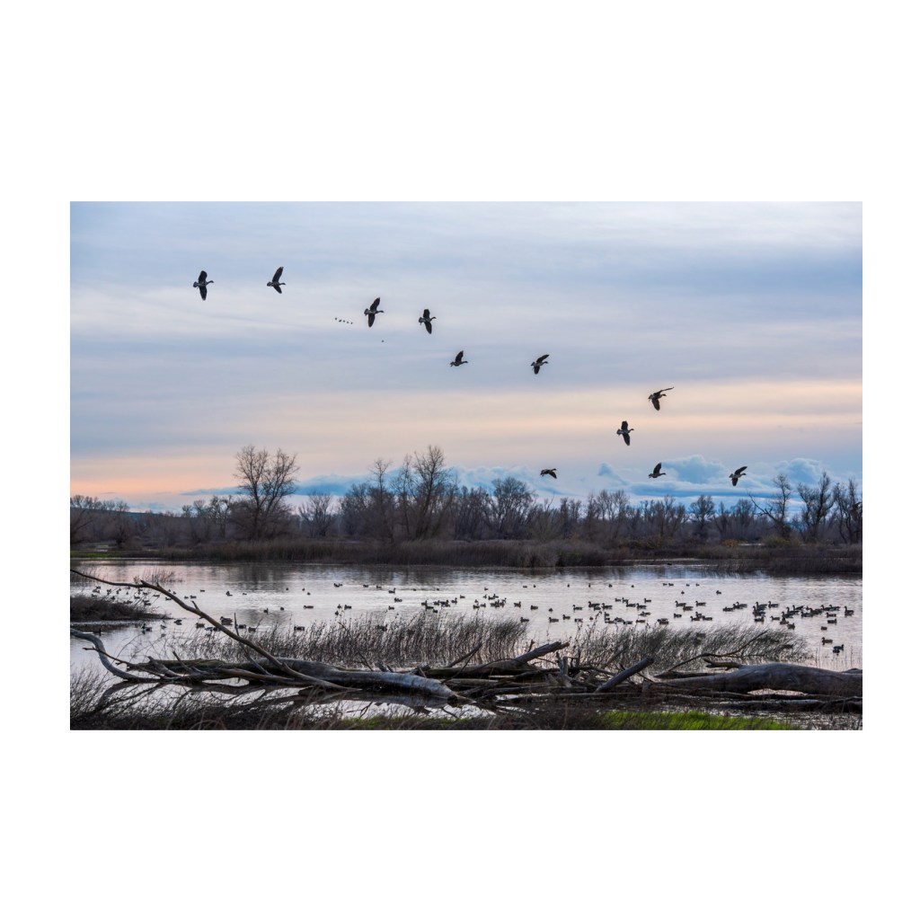 I have donated a copy of the FEATURED IMAGE, (f/5.6, 1/200s, ISO 360 @110 mm), repeated below for convenience, which I took at the Gray Lodge on January 23, 2024. The subdued colors are the environmental colors I found there, on a lovely evening of fresh air after rain, and high bird activity. There were some clouds covering the Sutter Buttes in the distance, and the sunset was fast approaching.