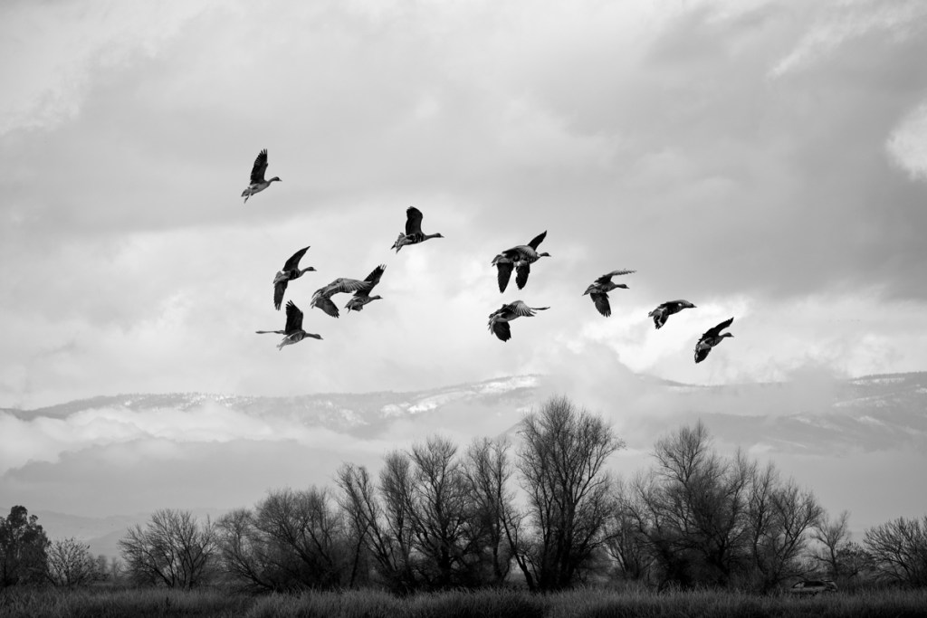 A color version of the FEATURED IMAGE was REJECTED by the Bucks for Ducks annual fundraiser. It features ducks flying over California’s Willow trees in the evening, with Mount Shasta in the background. Prints of this image can be purchased from my pixels website.
