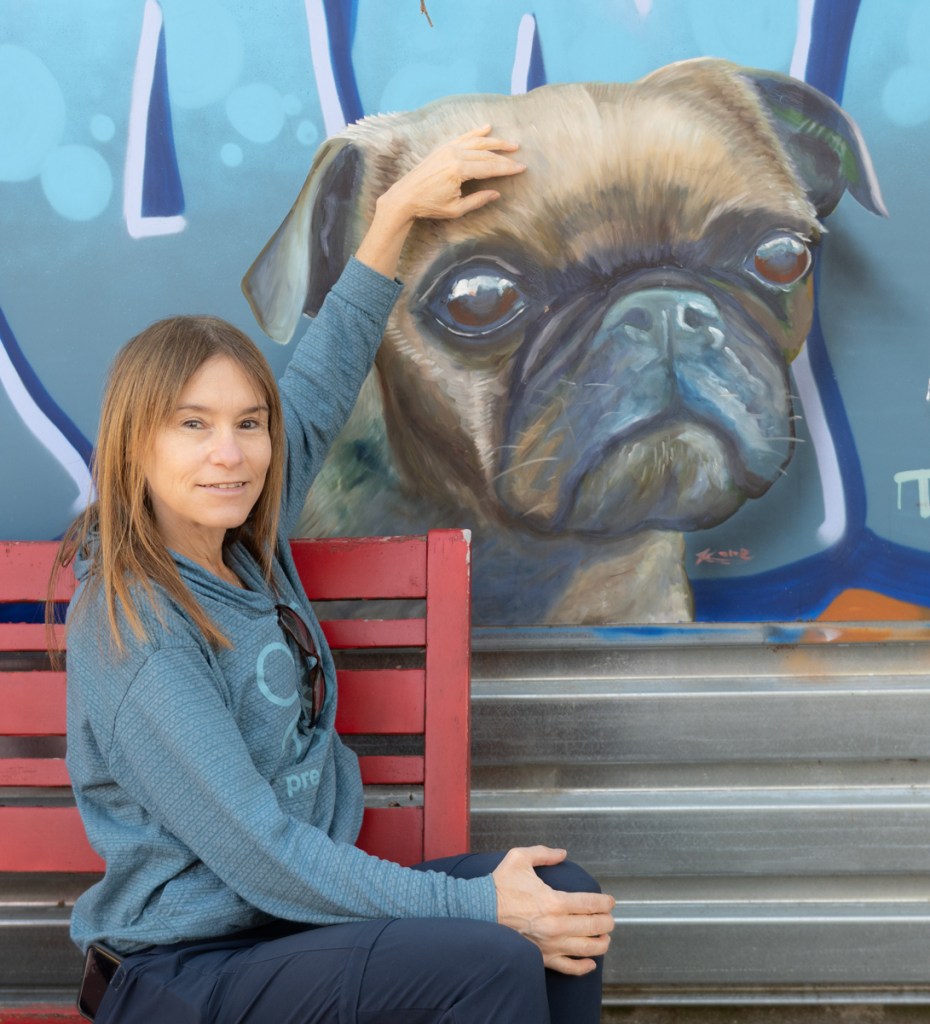 When I photograph murals, I like to isolate portions of them instead of photographing the whole thing. This makes me feel like I’m interpreting parts of the art and making it somewhat more personal. I also like interacting with them, as in one of the pictures below, where I’m petting a dog…